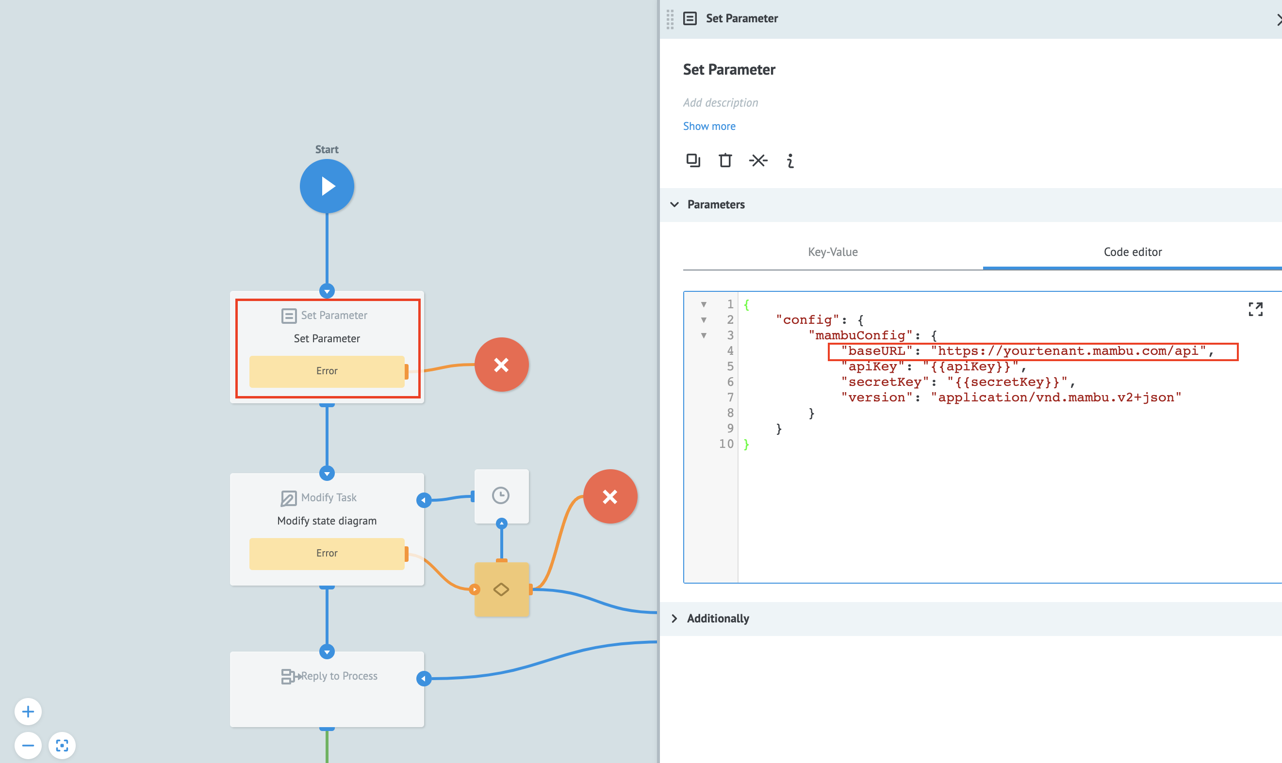 Find the Set configuration process in the MPO UI. Change the baseURL parameter in the Set Parameters node to be the URL of your Mambu tenant. Make sure to add /api to the end of the address.